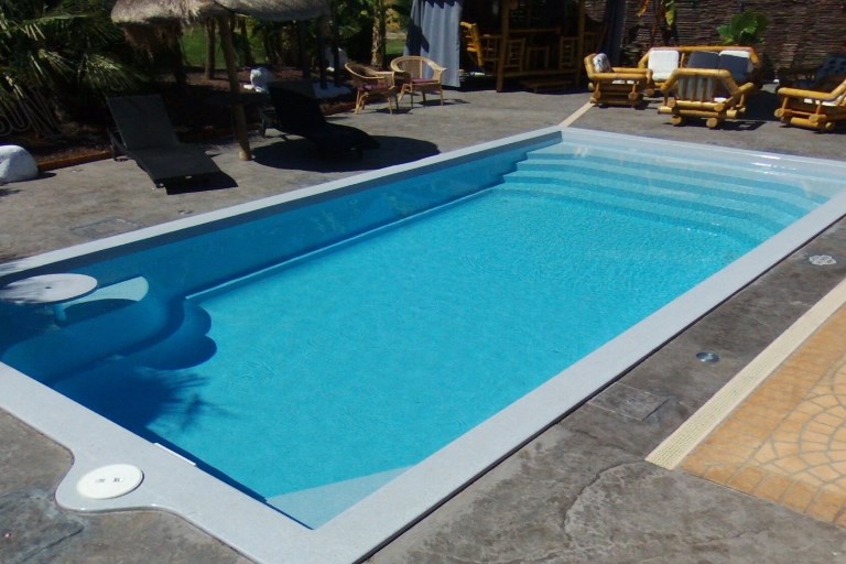 Les piscines coque Freedom comportent un antidérapant sur la margelle, les marches immergées ainsi que le fond de la piscine.